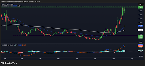 动量指标同样释放积极信号:MACD形成强势金叉(0.1515美元上穿0.1211信号线),扩张柱状图确认上升动能增强;RSI值75.17显示强劲买盘但未达极端超买水平,意味着在触及重大技术阻力前仍有上涨空间。