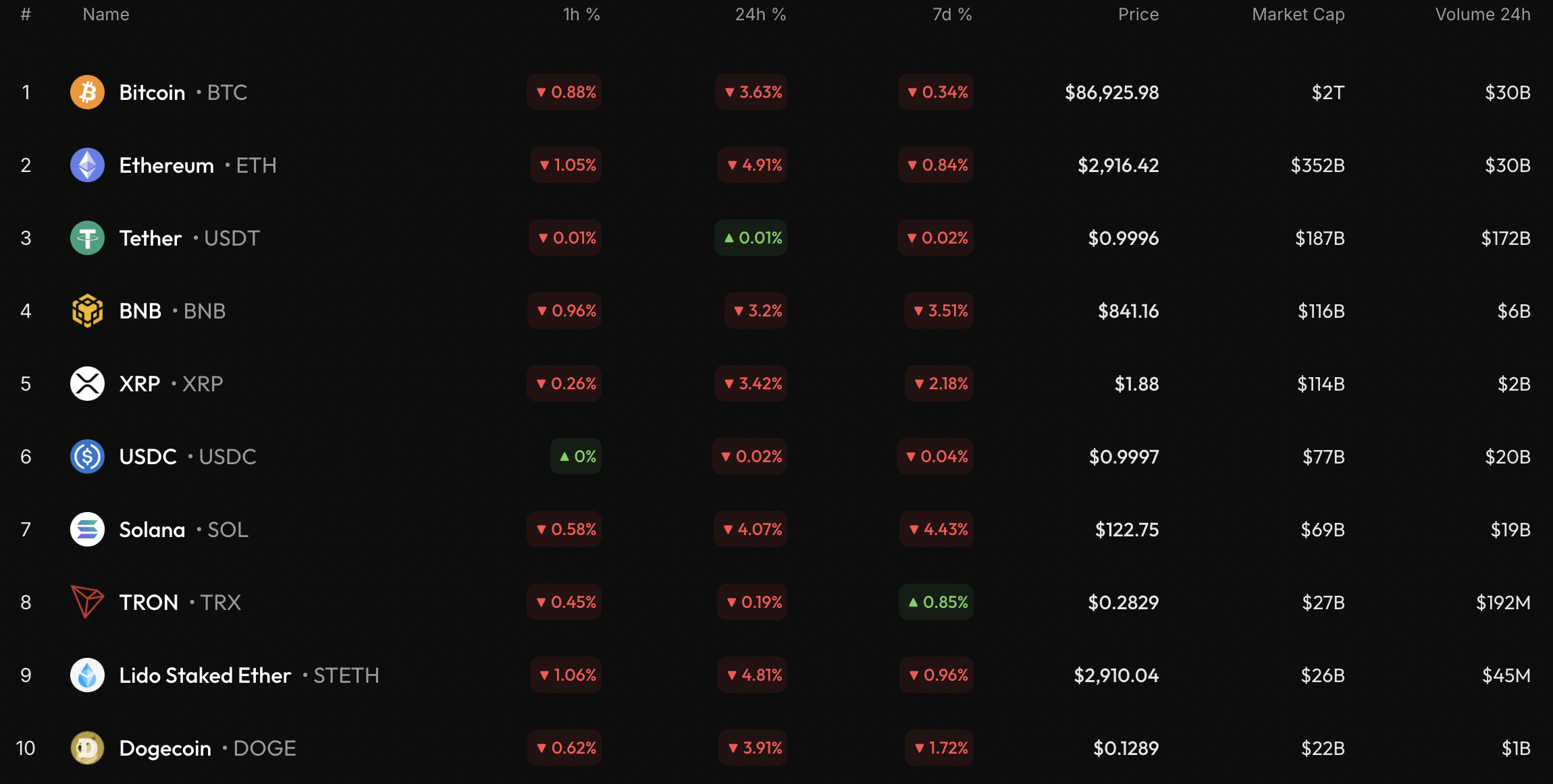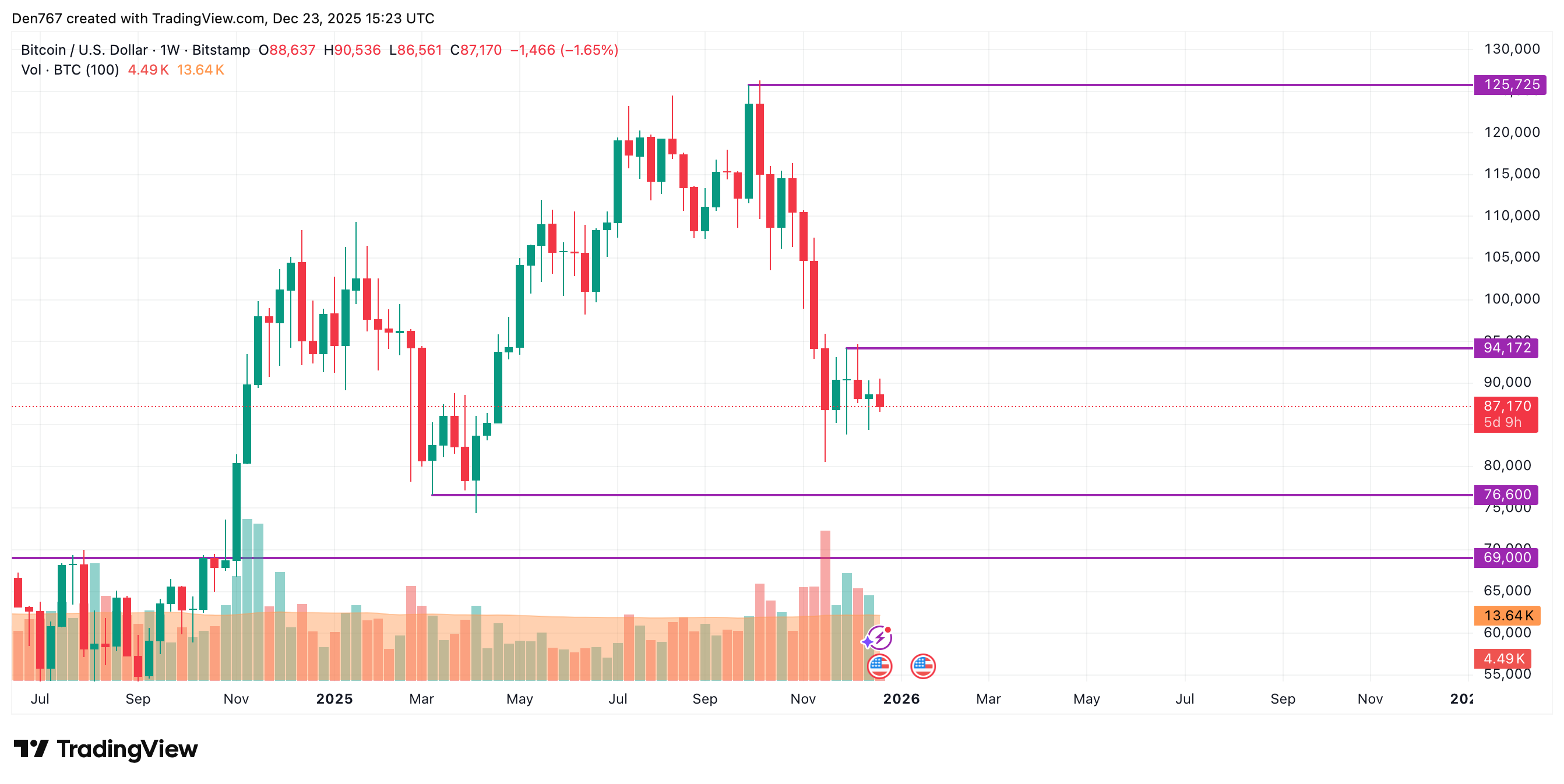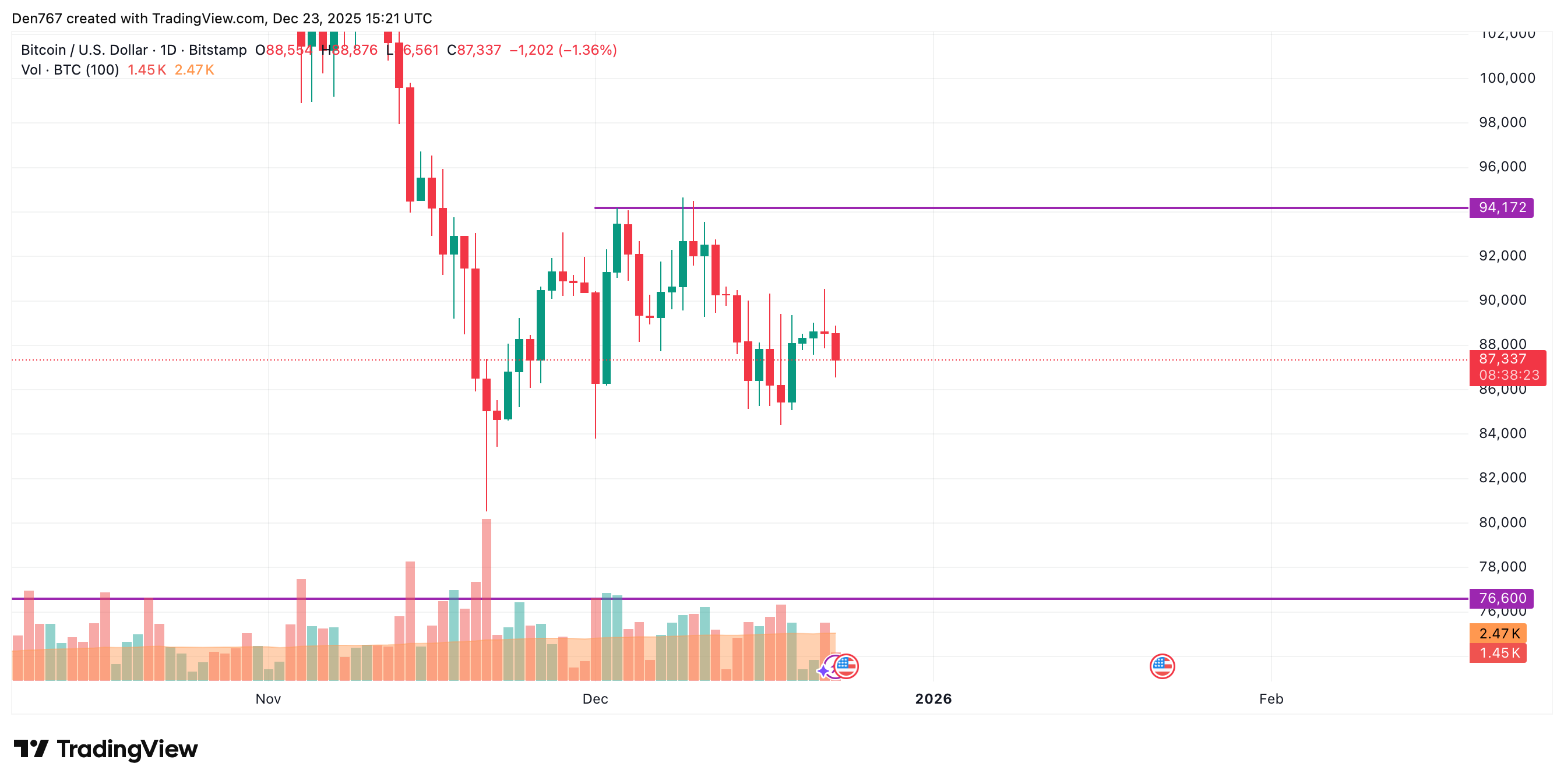 从更大时间框架观察,主要加密货币价格仍远离关键位。由于多空双方均未占据主导地位,最可能出现的走势是在86,000-89,000美元区间进行横盘整理。