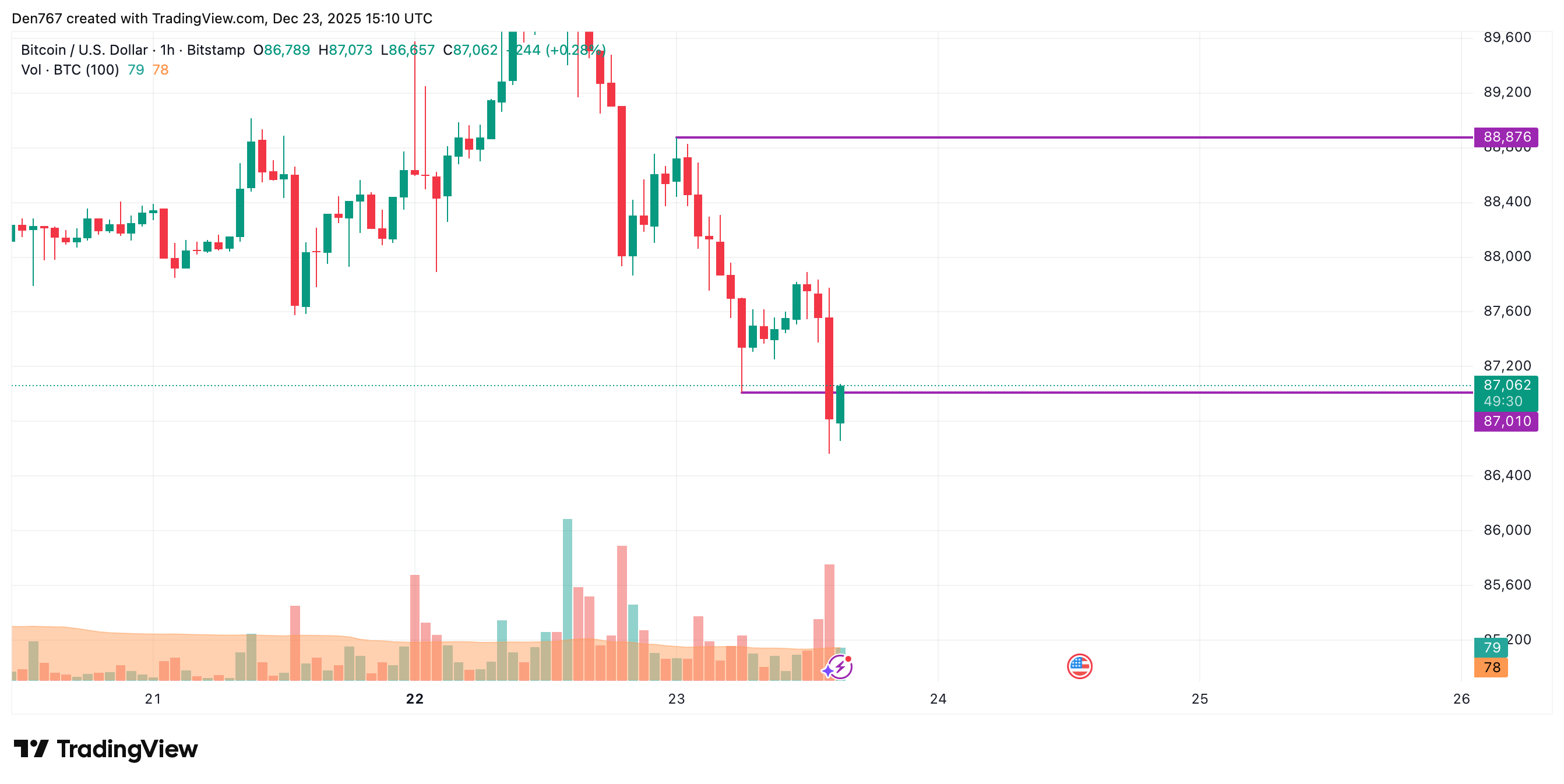 从小时图来看,BTC价格正位于87,010美元局部支撑位附近。若日线收盘价跌破该关口,交易者需警惕价格可能进一步下探至86,000美元区间。
