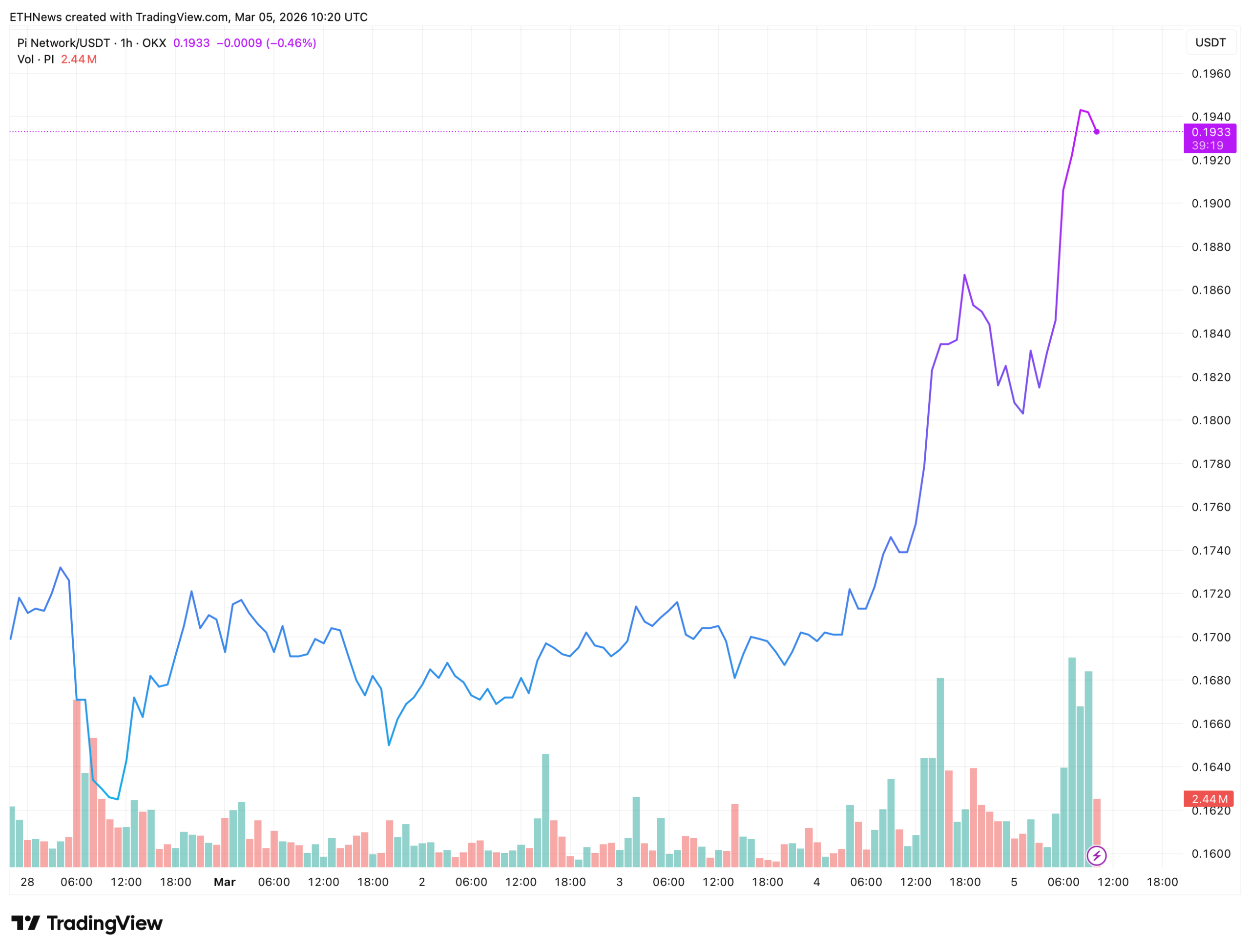 3月4日局势开始转变。价格从午后时段约0.1700美元持续攀升,短暂触及0.1870美元后回调至0.1800美元,随后在3月5日上午加速冲高至0.1940美元,最终稳定在0.1933美元。3月5日最新一小时成交量柱达到244万PI,创下全周最高纪录,证实本轮突破存在真实资金参与。