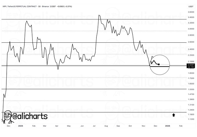 XRP持续在2美元关键区域上方震荡,该价位始终主导着2025年的价格走势。市场分析师阿里(@alicharts)指出,XRP必须坚守2美元防线才能避免跌向1.20美元。该关口在阻力与支撑角色间反复切换,强化了其技术重要性。