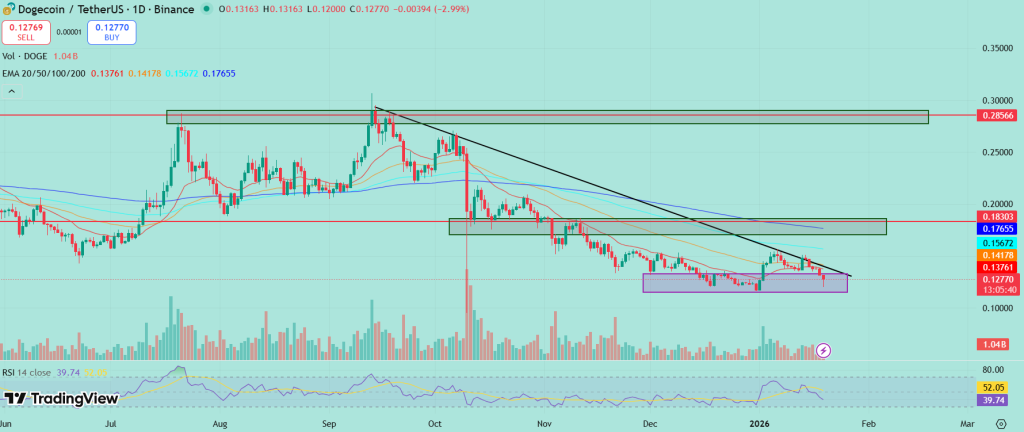 若DOGE未能稳固在0.12美元需求区附近,后续可能进一步下探0.10-0.11美元区间;反之若从支撑区域反弹,则可能在未来几个交易时段重新测试0.1320美元及0.1400美元的近期阻力位。