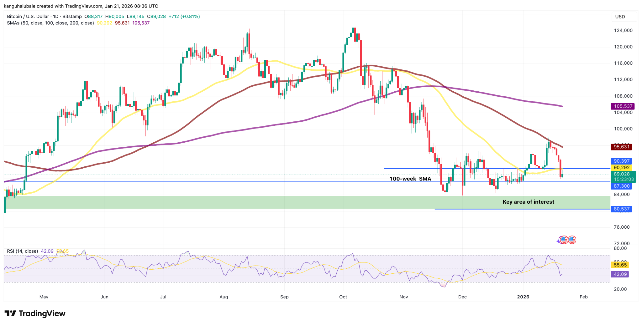 9万美元关口曾是多头关键防线,失守后或开启新下跌趋势。撰稿时BTC/USD交易于89,000美元,下一支撑位于87,300美元(即100周简单移动平均线)。若继续下破,84,000美元心理关口与11月22日低点80,500美元构成的区间将成为关键观测区域。