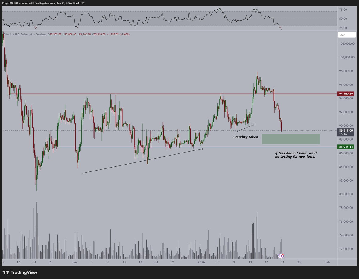 MN Capital创始人Michael van de Poppe周三分析称:“地缘政治恶化使比特币跌破震荡区间加速下行。”其附图显示价格正逼近84,000-86,000美元潜在支撑带,四小时RSI指标“已接近跌至8万美元时的超卖状态”。他强调:“这可能引发短期反弹,而非趋势反转。”