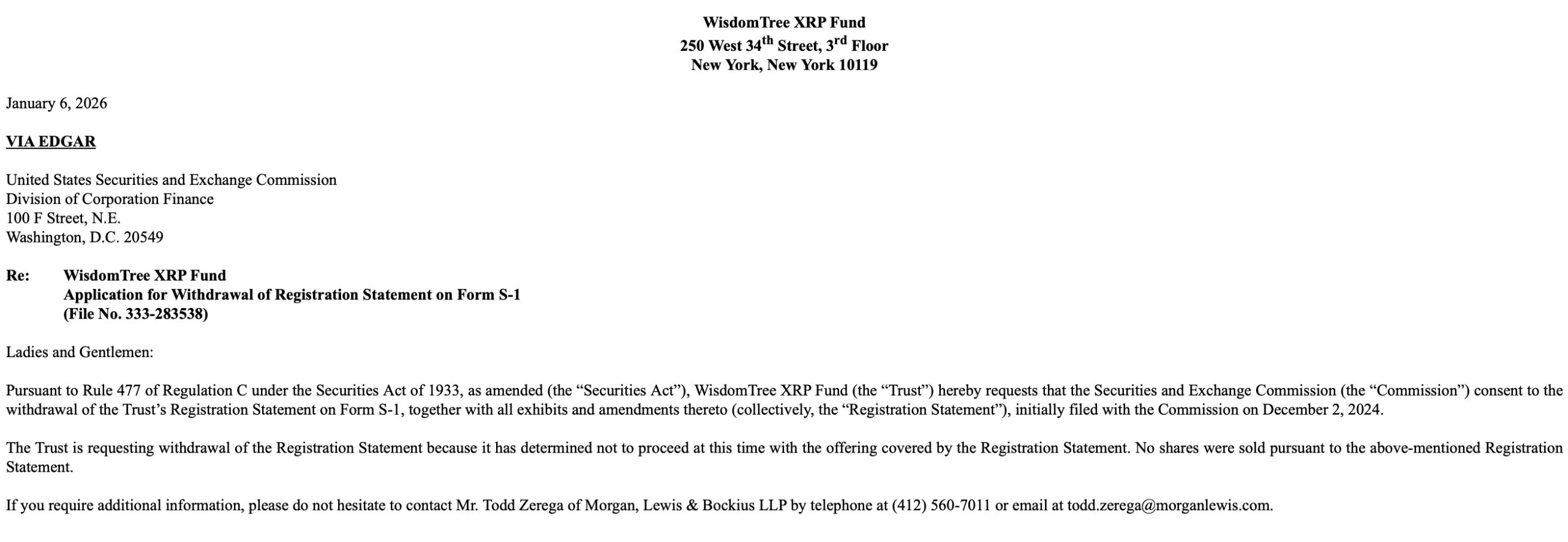 智慧树公司已向美国证券交易委员会撤回了其现货XRP交易所交易基金的注册声明,该撤回自2026年1月6日起生效。这一决定正值投资者对XRP相关产品的兴趣持续高涨之际,使得此举在更广泛的数字资产ETF领域中尤为引人注目。