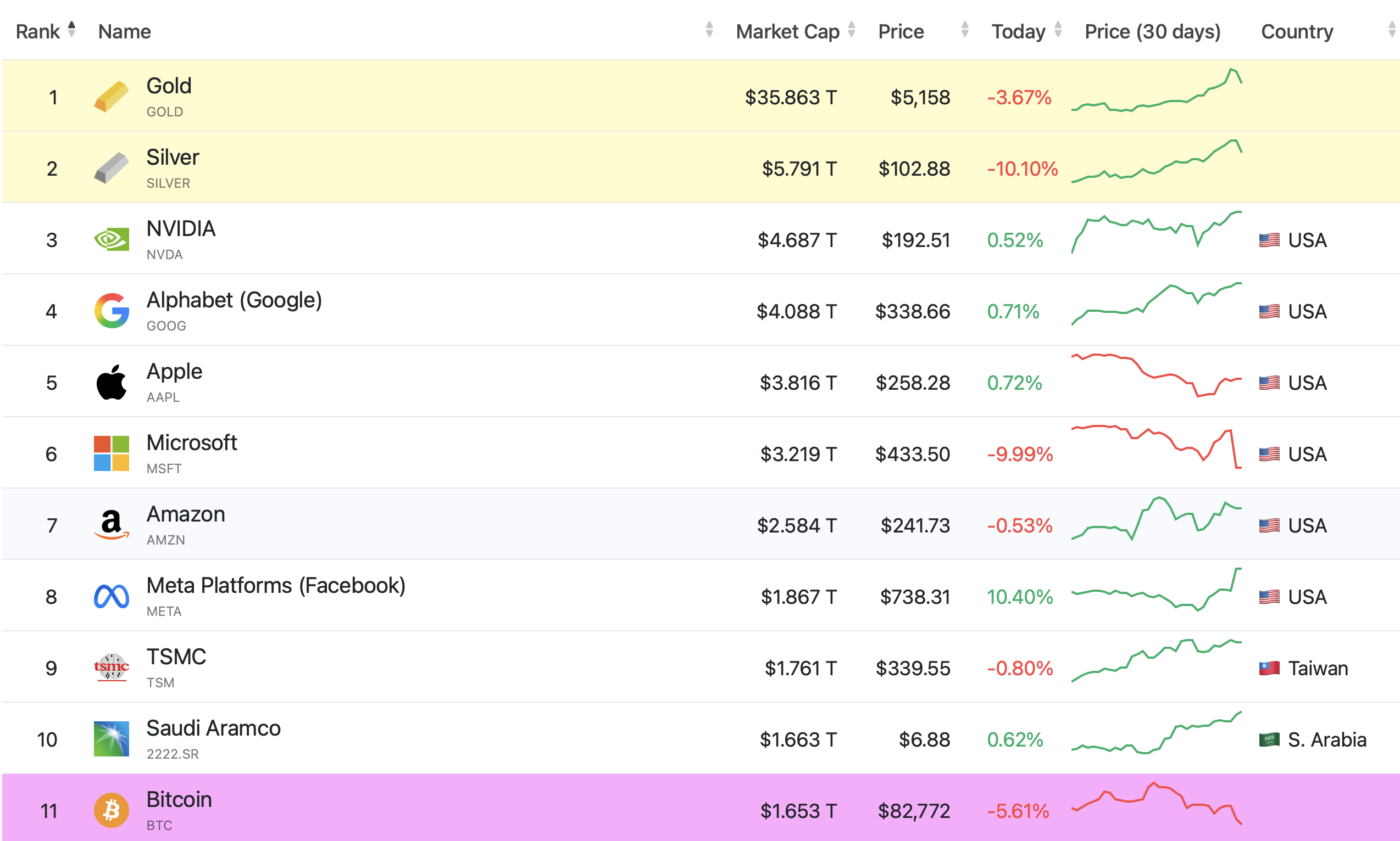 按市值计算,全球前两大资产为黄金与白银,两者均稳居股票和加密货币之前。