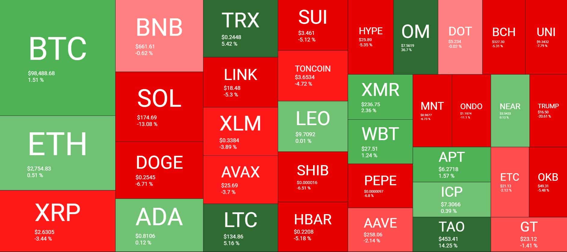自那以后,BTC收复了一些失地,目前略高于98,000美元,这意味着自上周同期以来上涨了1.5%。在大盘替代币中,TRX和LTC表现最佳,而SOL和DOGE跌幅最大,其次是LINK、TON、SUI、SHIB、PEPE等。