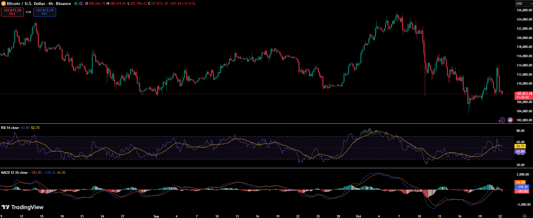 四小时图表显示,BTC从近期低点短暂反弹后进入盘整阶段。相对强弱指数(RSI)位于52附近呈中性,MACD指标显示金叉后看涨动能有所减弱。