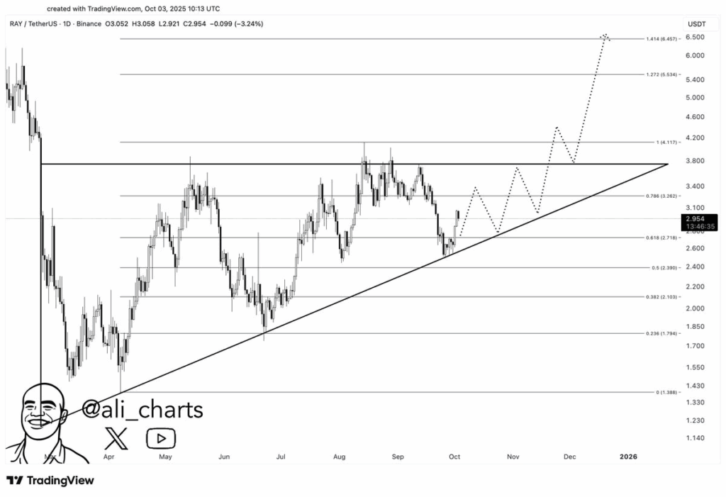 Raydium(RAY)持续在长达数月的积累区间内震荡。价格结构显示上升趋势线支撑下的低点逐步抬高,表明市场阻力下需求仍受控。分析师Ali(@ali_charts)指出RAY正处于扩张前的盘整状态,3.80美元为预期突破位,6.50美元的技术目标对应1.414斐波那契延伸位,与整体结构吻合。