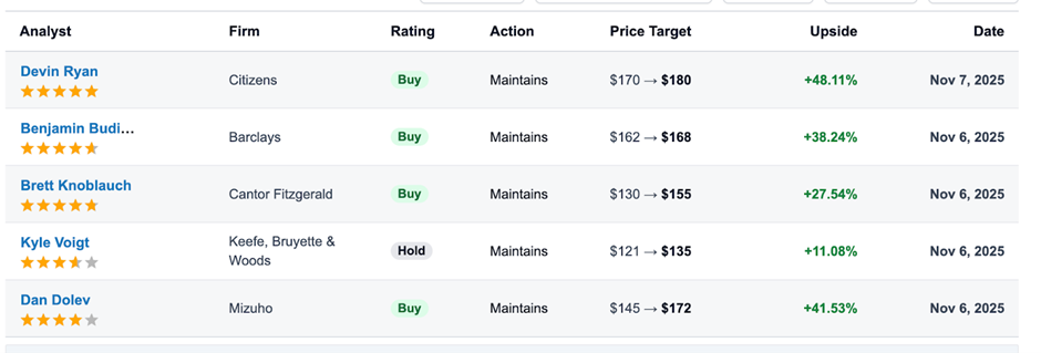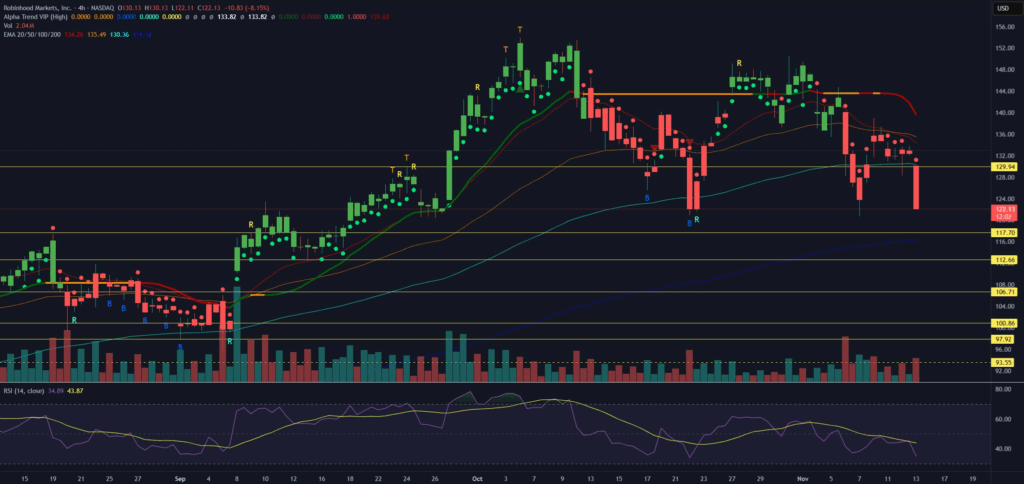 Robinhood(HOOD)第三季度表现强劲:月活跃用户攀升至1280万(创一年多新高),加密货币交易收入增长89%,每股收益0.61美元超出预期。但即便数据向好,股价仍从150美元区域跌至121美元附近。