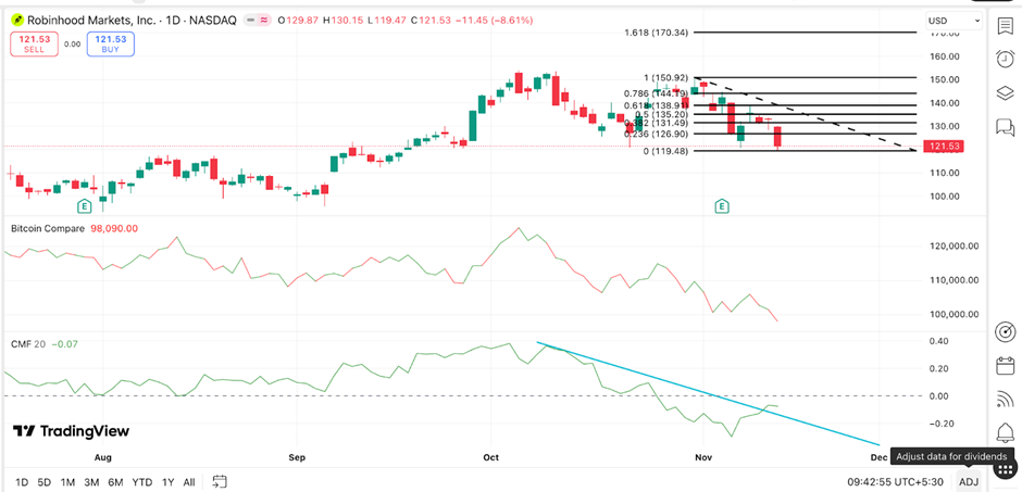 尽管Robinhood第三季度营收增至6.08亿美元且加密货币收入增长89%,其股价仍出现下跌。下跌与现货加密货币交易疲软相关,当前市场波动主要来自期货交易——而Robinhood并未提供此类服务。HOOD股价现报121美元附近,若比特币回升或能带动其复苏,突破138美元将显示买盘动能增强。