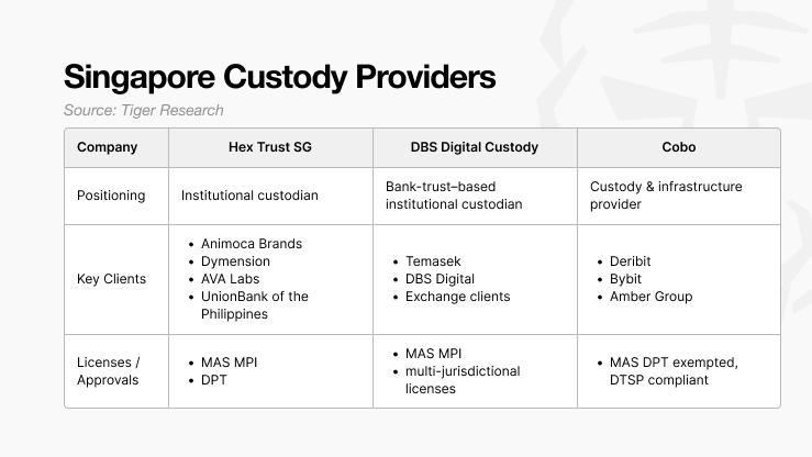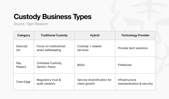 托管服务商主要分为三类:传统托管商专注监管合规、混合模式追求服务多元化、技术提供商通过安全性和API基础设施竞争。新加坡、香港、日本和韩国各自建立了差异化的本地托管框架。