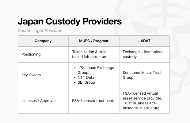 金融厅(FSA)要求95%资产冷存储,剩余部分需全额抵押。三菱UFJ/Progmat等传统金融机构主导市场,凸显严格监管下传统金融的优势。