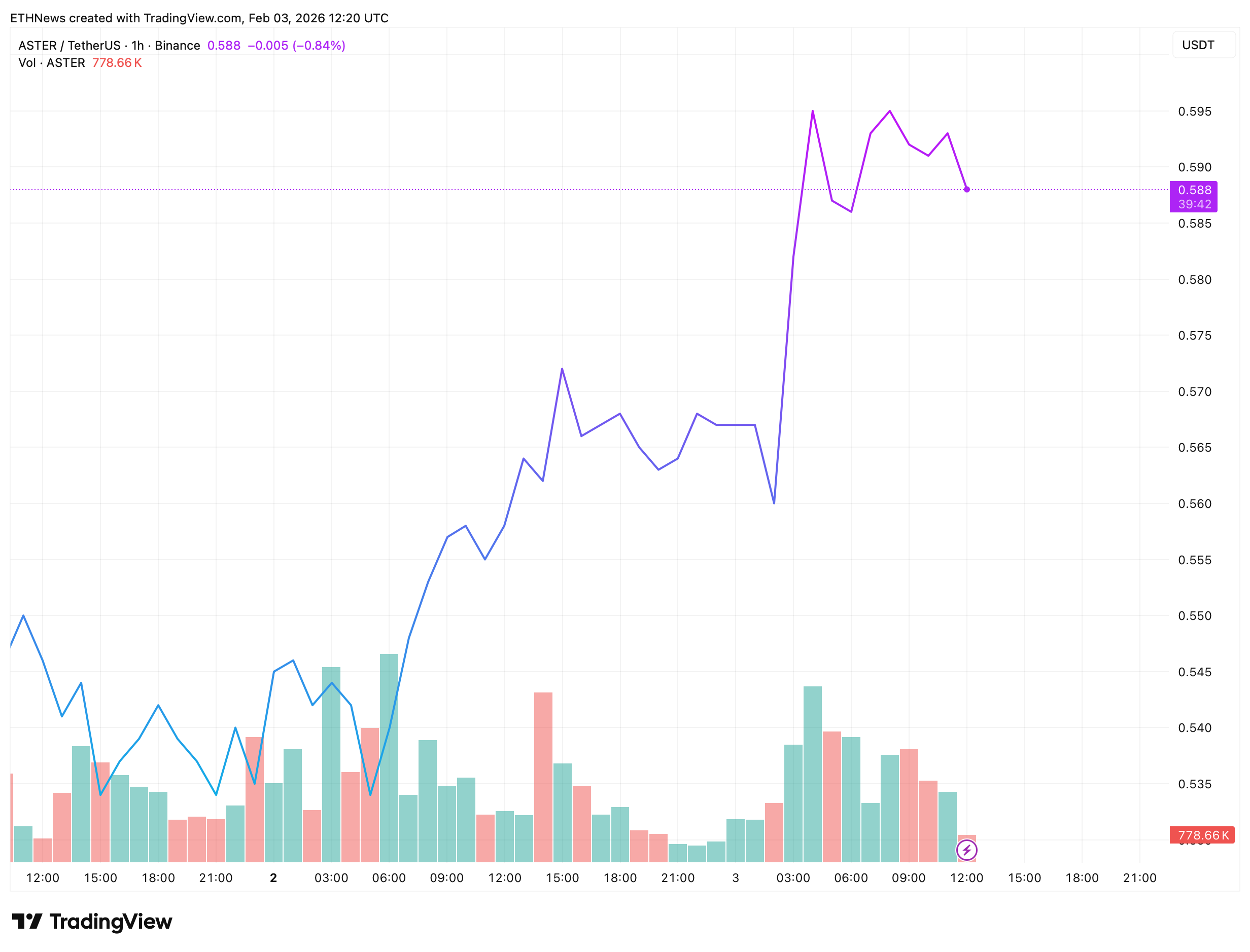 在TradingView图表中,ASTER在急涨后试图企稳,但未能维持在0.59-0.595美元区域上方。