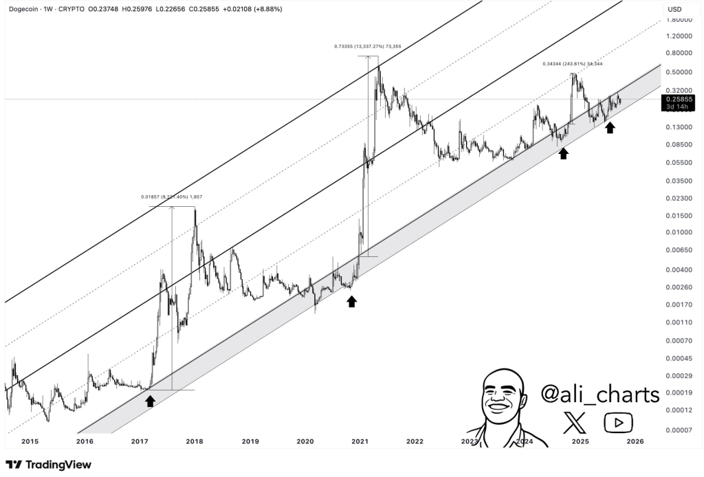 分析师Ali指出,DOGE当前价格行为与2017年、2021年积累阶段如出一辙,这两个阶段后续分别带来了9,241%和13,337%的惊人涨幅,强化了当前形态的参考价值。