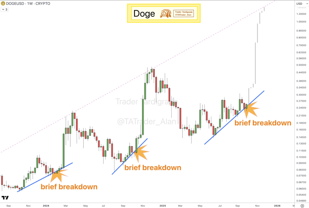 交易员Tardigrade观察到,DOGE持续测试上升支撑线,该形态与2024年初及年末的筑底阶段相似。此前每次跌破支撑后均引发向0.30-0.40美元的强势反弹,验证了该模式的可靠性。