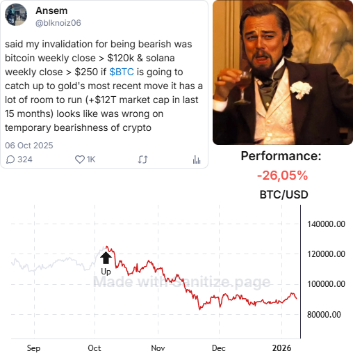 安森姆于2025年转向看涨后,比特币随即出现大幅回调。其预测时机过早,导致比特币价格下跌26%。