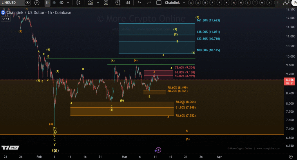 Chainlink一直在8.36美元至9.35美元的狭窄区间内交易,当前价格徘徊在8.88美元附近。根据分析师More Crypto Online的观点,这种区间震荡行情出现在小时图完成5浪结构之后,其中8.36美元是重要的支撑位。价格必须维持在8.36美元支撑上方,以避免看跌突破。