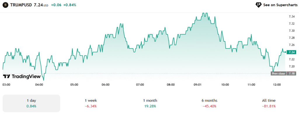 在当下山寨币热潮中,这款与美国前总统特朗普关联的代币因新奇性和政治元素引发交易者兴趣。但市场情绪明显呈现投机特征,$TRUMP价格从7.18美元微升至7.24美元的同时,剧烈波动暴露了需求不足的实质。