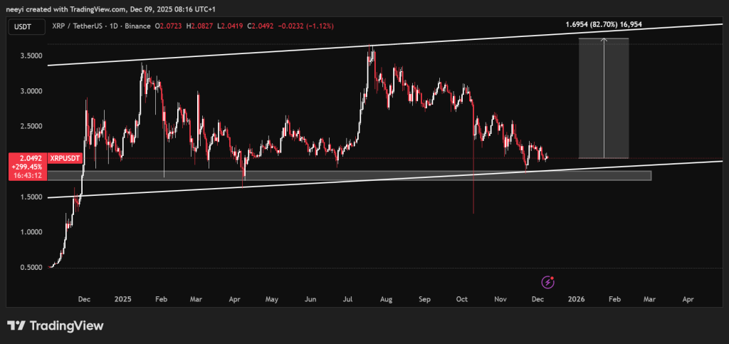 瑞波币现报2.04美元,正位于自2024年12月形成的水平支撑线上。近一年来,该代币已多次从此区域反弹,每次触及都会引发市场反应,但始终未被有效击穿。这一历史轨迹使其成为买方重点关注的天然防御阵地。
