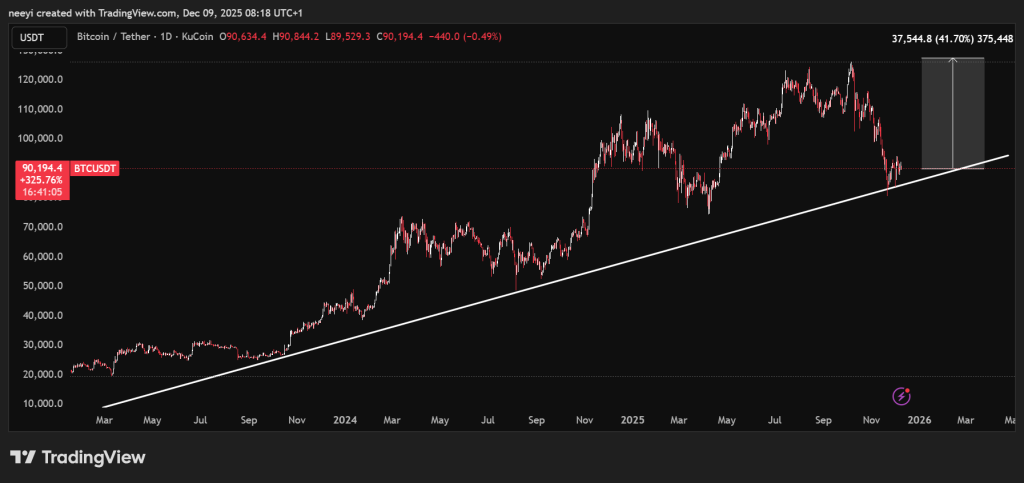 比特币在90,000美元关口徘徊,其依托的长期趋势线自2023年初始终主导上行趋势。历次重大回调均在此线获得支撑,每次触碰后比特币都会构筑更高低点,继而开启冲向新高的征程。当前格局与历史情景如出一辙。