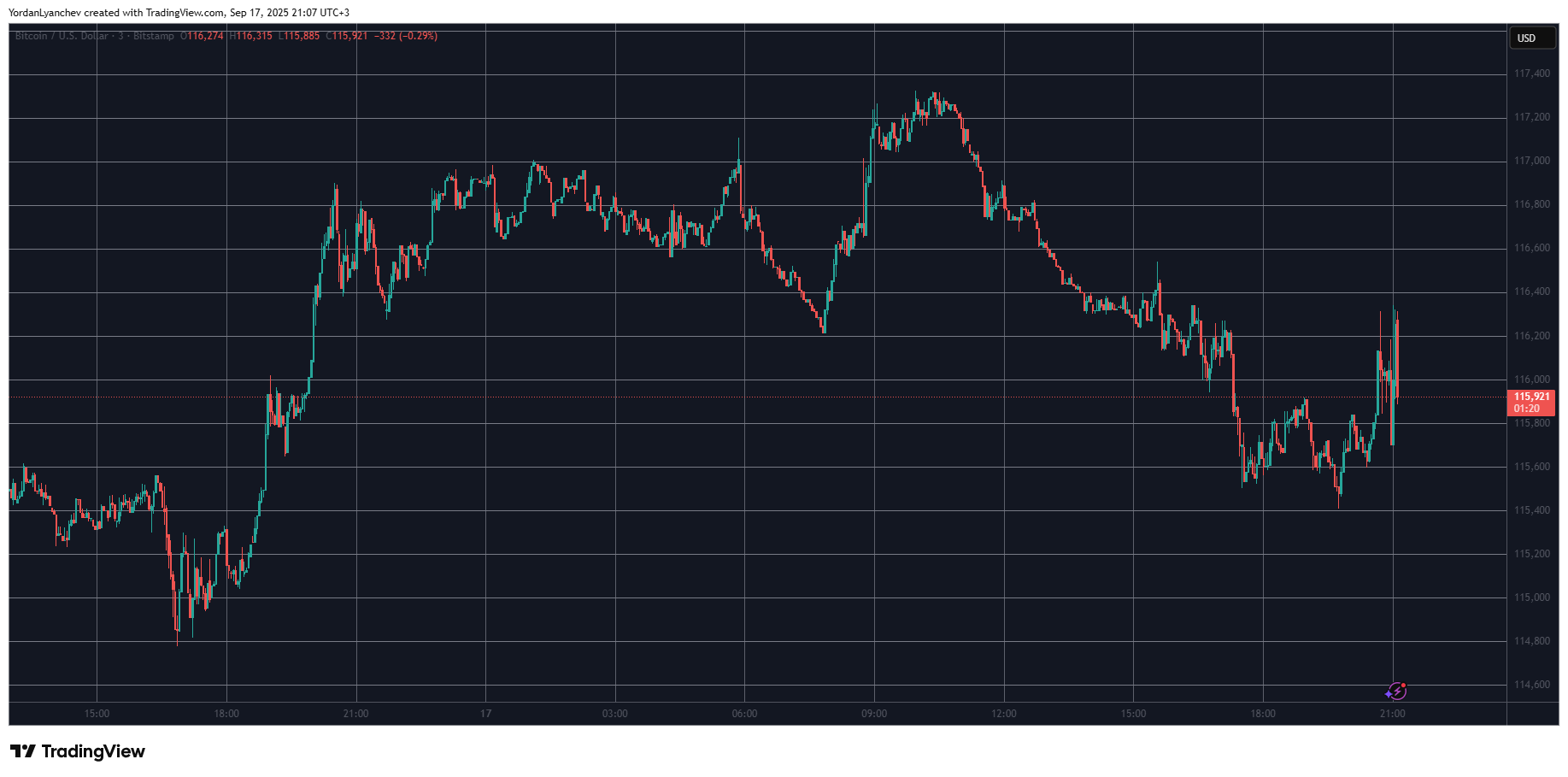 在美联储决议公布前的数日,比特币价格持续攀升,并于今日早间触及117,200美元的四周高点。然而决议公布后数小时内,其价格急挫近2000美元。截至目前,比特币对实际降息举措的反应相对平淡,仍维持在116,000美元水平附近波动——这与决议公布前数分钟的价格基本持平。