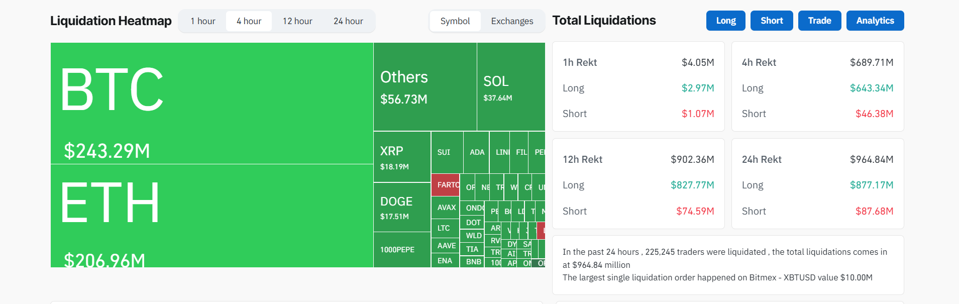 数据显示,过去24小时内共有9.6484亿美元仓位被强平,其中8.7717亿美元为多头仓位。比特币相关强平金额达2.4329亿美元,以太坊则以2.0696亿美元紧随其后。同期超过22.5万名交易者遭遇强平。