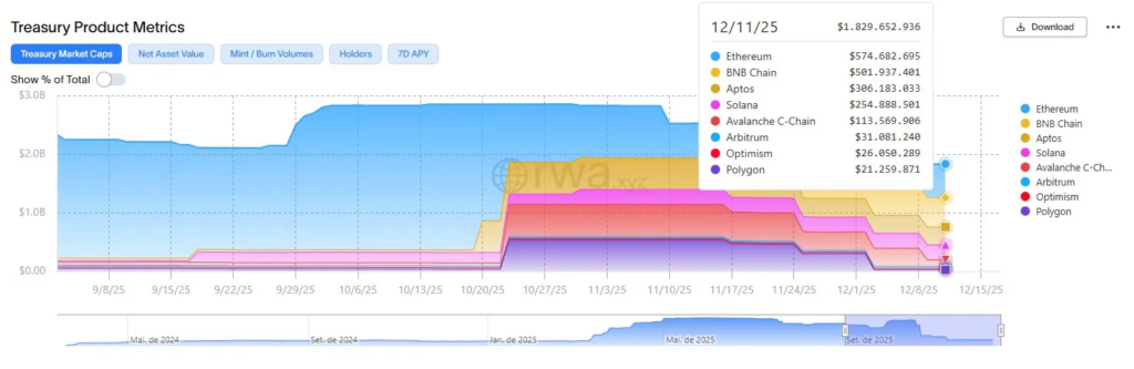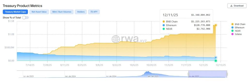 截至12月11日,USYC管理资产中约12.2亿美元集中于BNB Chain,反映出该基金与币安机构基础设施的深度融合。在六个月内,Circle将代币化货币基金规模从7月的2.42亿美元提升至13.4亿美元,增幅超五倍。这一扩张恰逢市场对代币化国债需求激增,自2025年初以来该类资产规模已近翻番。
