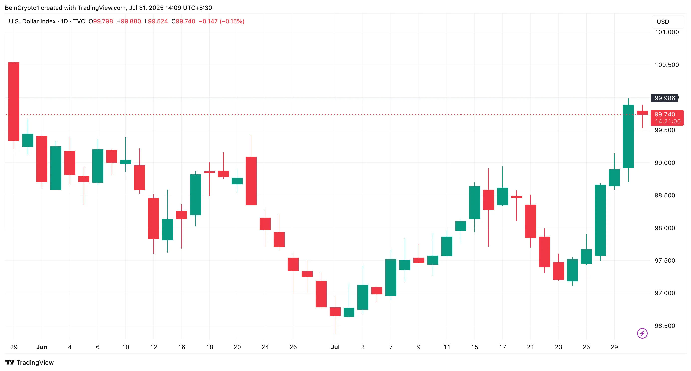 周三(7月30日),美元指数(DXY)飙升至99.98点,创下两个月新高。此前美联储决定将基准利率维持在4.25%-4.50%区间不变。值得注意的是,在美元走强的同时,比特币(BTC)价格应声下跌,再次印证了美元指数与比特币的负相关性,以及利率政策对加密资产的影响。