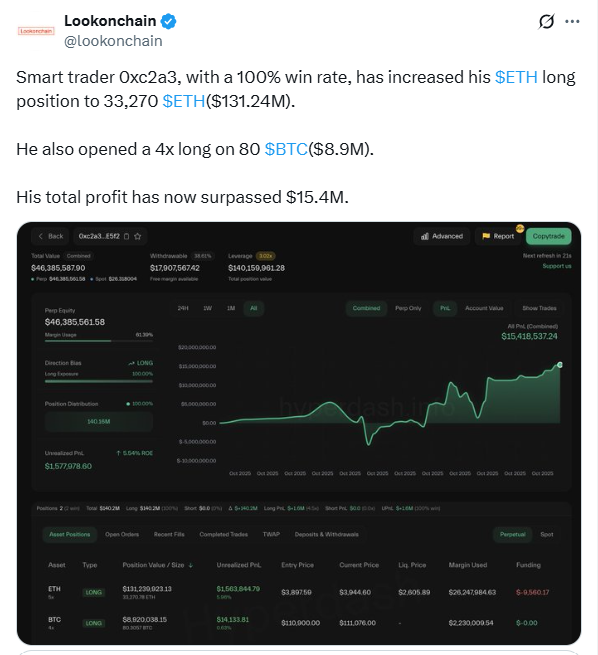 链上数据监测显示,知名交易员0xc2a3钱包近期再次扩大其多头头寸,该钱包保持着100%胜率的完美交易记录。其ETH多头仓位已增至33,270枚(价值1.3124亿美元),同时开启80枚比特币(价值890万美元)的4倍杠杆多头。目前该交易员总利润已突破1540万美元,此次加仓恰逢以太坊价格在3800美元附近反弹。