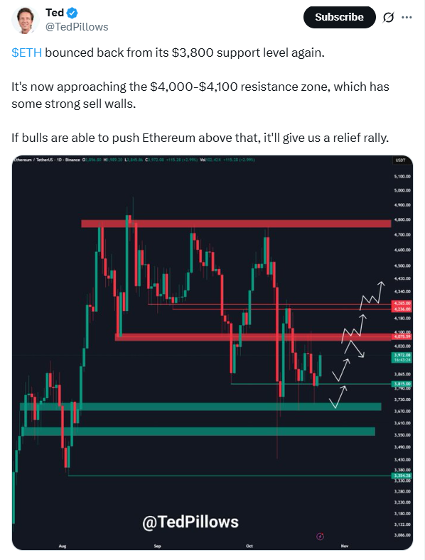 分析师指出,若买方持续活跃,以太坊价格重返4000-4100美元区域时可能引发趋势转变。该阻力区曾多次压制价格上涨,目前该价位仍存在大量卖单。交易员期待看到价格形成有效突破,若成功则可能打开通往4500美元的通道,反之或将回落至支撑位。