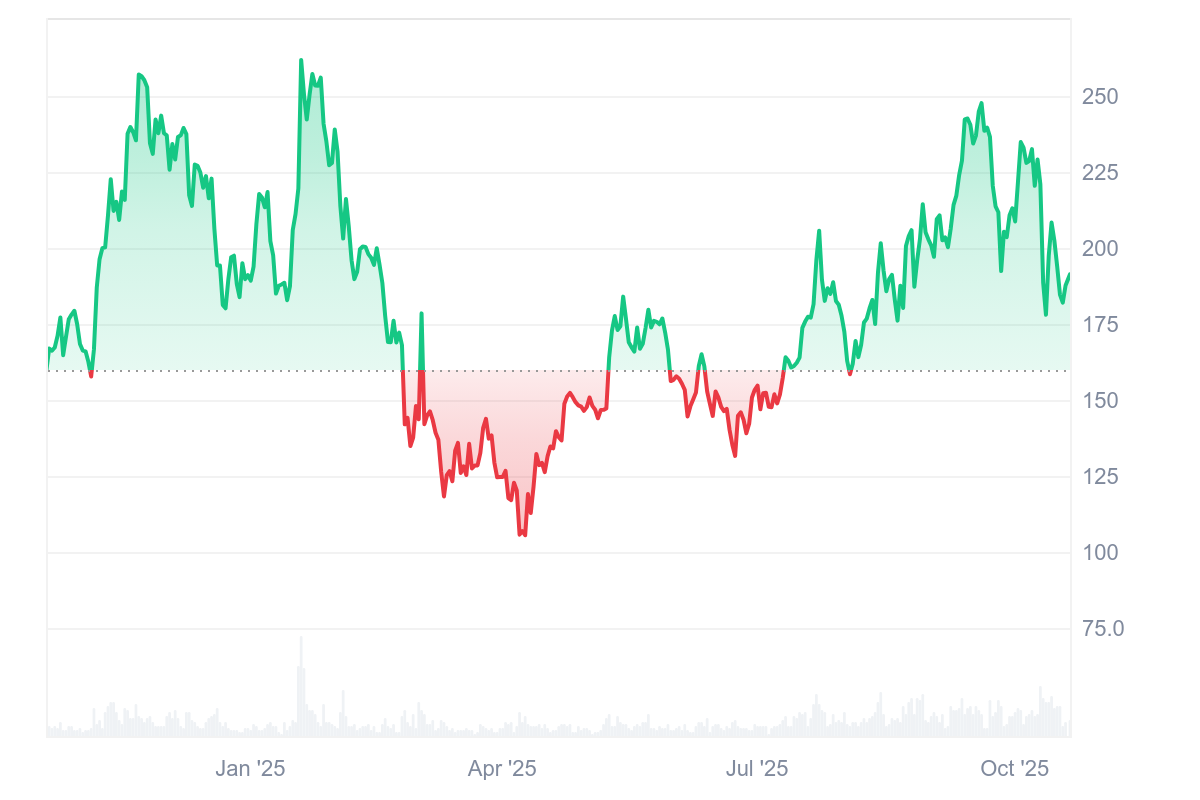 从技术面分析,Solana仍保持稳健态势。该代币已多次在150-170美元区间筑底,形成逐步抬高的低点结构,正逐步逼近200美元关键阻力位。若周线能明确收于该价位之上,可能打开通往300美元甚至长期500美元的大门。
