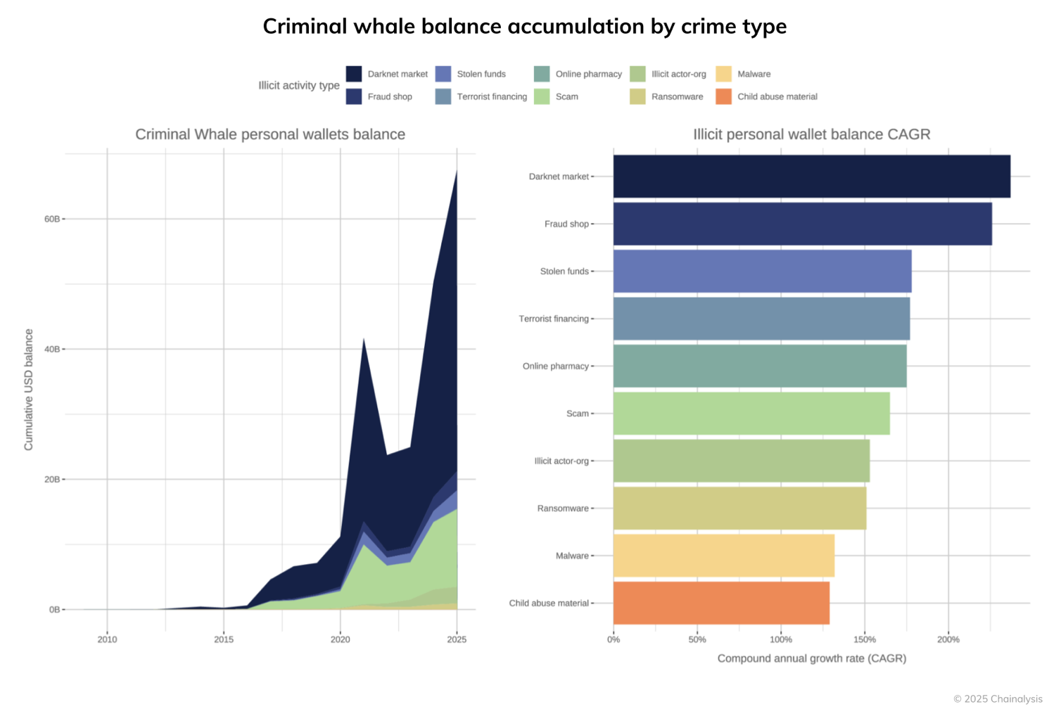 根据Chainalysis截至2025年7月的最新交易数据显示,犯罪网络目前控制的加密货币规模估计达750亿美元,这些资金均通过非法活动获得。该数字较2020年激增359%,凸显出非法加密货币使用与合法应用同步扩大的趋势。