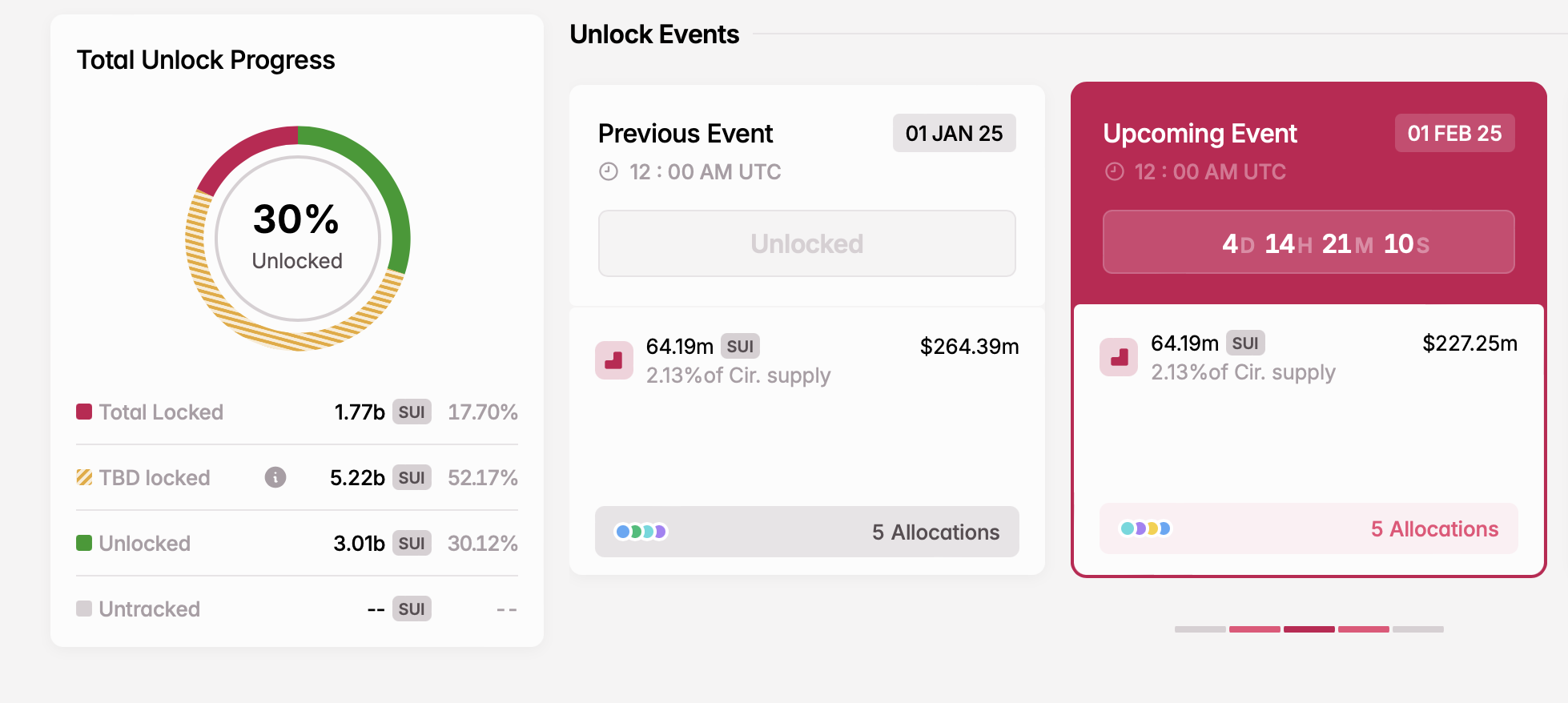 BeInCrypto还报道了本周的代币解锁事件。其中,Sui预计将于2月1日向市场释放6419万枚SUI代币。按当前汇率计算,这些代币价值2.2725亿美元,占流通供应量的2.13%。这些代币将分配给社区、早期贡献者、Mysten Labs金库以及融资轮参与者。
