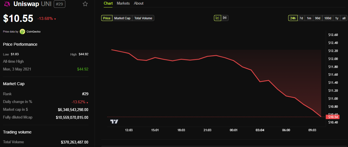 此次升级可能为Uniswap奠定更坚实的基础,有望提振市场信心,进而推高UNI价格。尽管市场预期良好,但BeInCrypto数据显示,Uniswap的UNI代币当前交易价格为10.55美元,自周一开盘以来下跌近14%,显示出市场对此次升级的反应相对平淡。