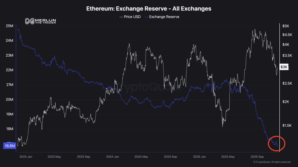 以太坊交易所储备已降至历史最低水平,这一下降反映出交易平台可用供应量急剧减少。虽然以太坊价格呈现小幅上涨,但流动性供应减少可能预示关键市场转变。