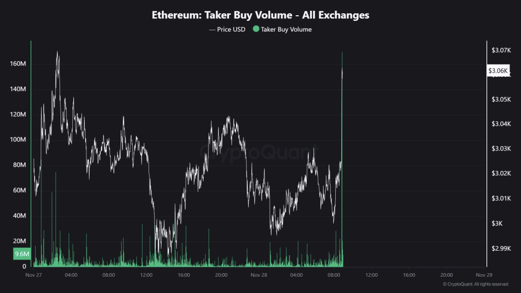 与此同时,以太坊期货市场显示出买盘活动增加的迹象。据Maartunn称:“全网交易所主动买入量刚刚达到1.206亿ETH。”这表明交易者正在建立更多多头仓位。