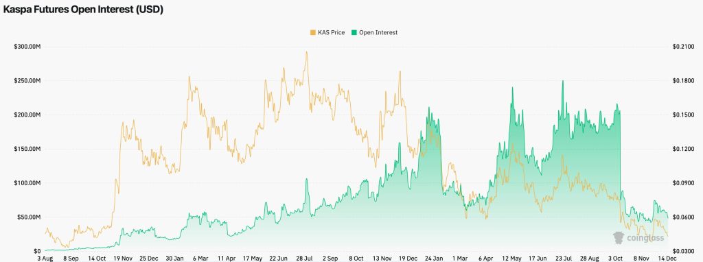 2024年出现类似未平仓水平时,Kaspa正处于上涨周期。现货需求活跃,参与度持续增长,杠杆资金伴随真实买盘涌入。这种合力支撑了价格上涨并维持了市场动能。