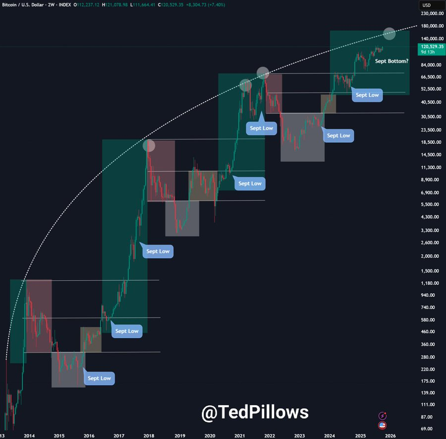 Ted的长期分析指出比特币存在9月形成周期底部的规律。2016年以来的记录显示七次9月低点后均出现反弹。