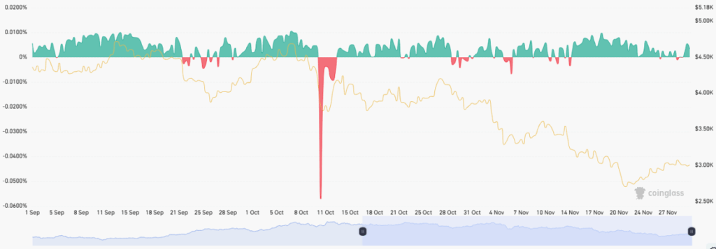 10月10-12日期间资金费率急剧转负,显示快速下跌过程中空头压力加剧。即使后期资金费率恢复正常,价格仍向2900美元下行。这种背离表明倾向多头的交易者试图稳定市场,但结构依然脆弱。