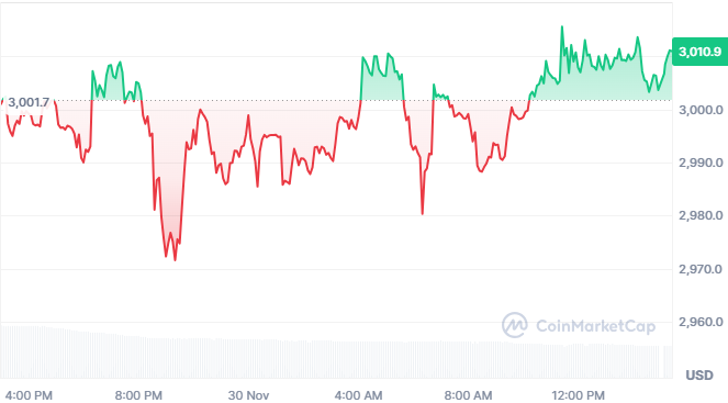 短期走势显示以太坊反复测试3000美元区域,在该水平两侧均出现波动。早期时段ETH曾跌破该门槛,卖家推动价格快速下探2970-2980美元区间。每次下探都引发反应性买盘,但缺乏持续力量。