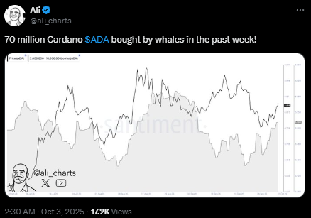 本周ADA大额交易量显著攀升。市场分析师Ali Martinez报告称,巨鲸累计吸纳约7000万枚ADA。这一活动与价格温和波动相呼应,暗示大额投资者正为潜在上涨布局。