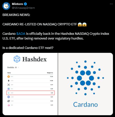 卡尔达诺在被短暂移除后,重新入选Hashdex纳斯达克加密指数美国ETF。此前下架源于监管不确定性,而最新决定反映合规态度的转变。分析师表示,重新纳入为机构投资者提供了配置ADA的新渠道。