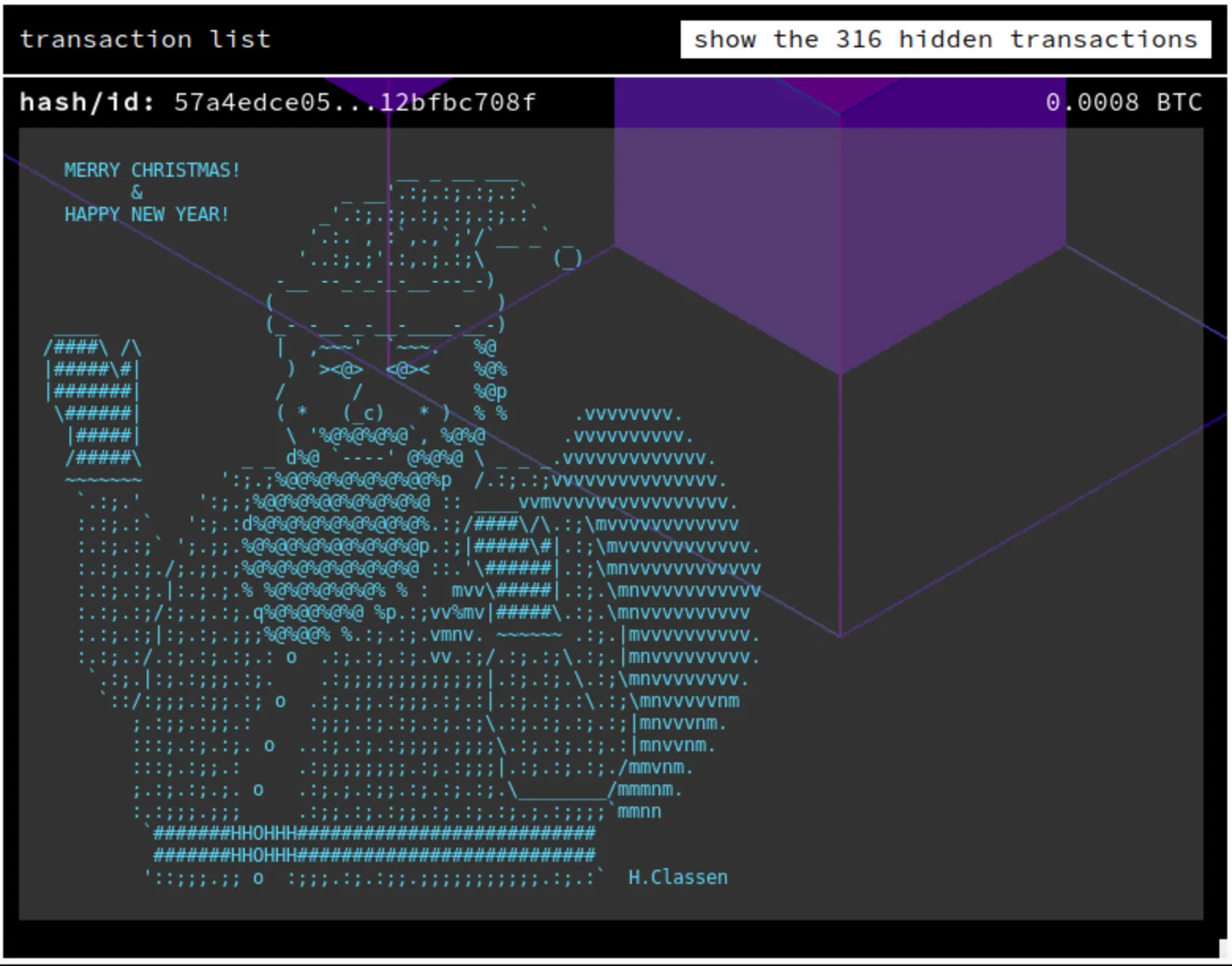 ASCII艺术是一种流行的彩蛋,而比特币爱好者H. Classen于2014年12月19日发布的“圣诞快乐”是另一个很好的例子。