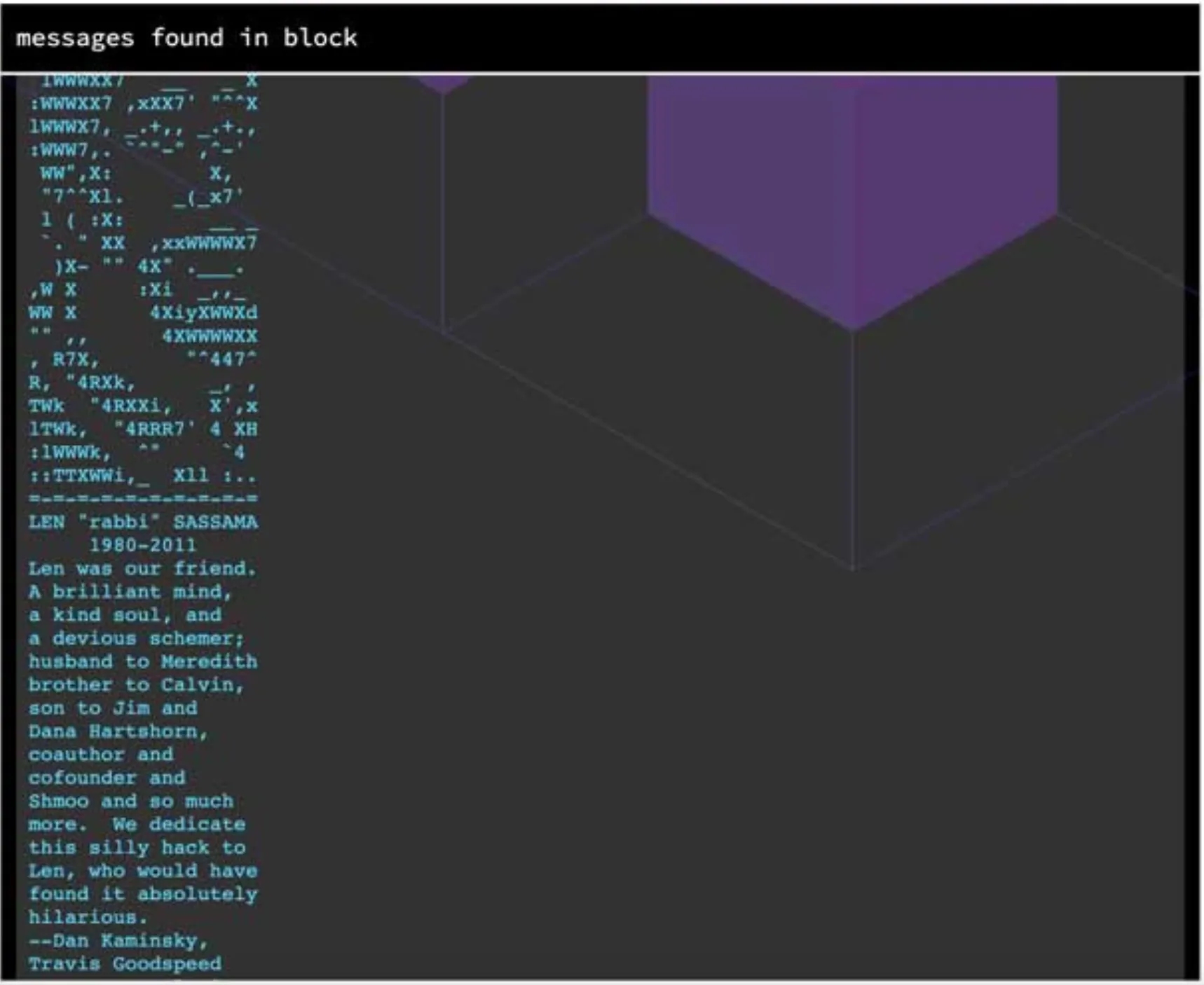 在密码学家Len Sassaman去世后,他的同行程序员Dan Kaminsky和Travis Goodspeed在比特币区块链中为他留下了致敬。