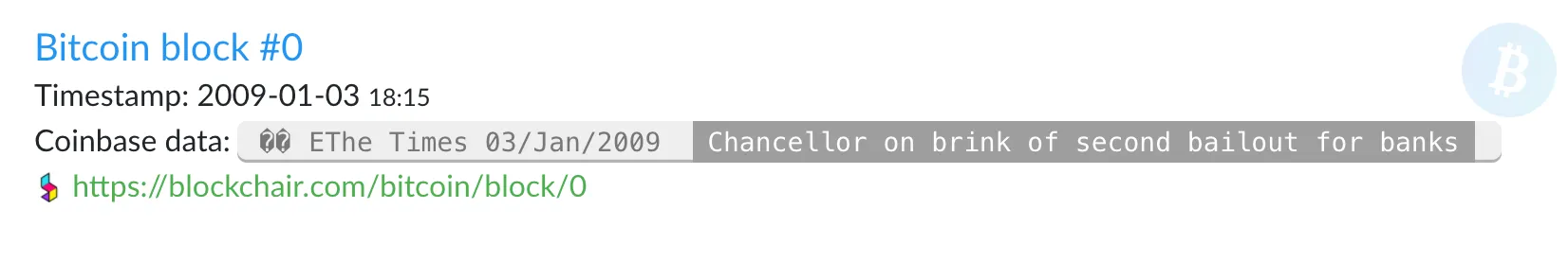 它由协议的匿名创建者中本聪(Satoshi Nakamoto)插入,内容是2009年1月3日《泰晤士报》头版头条:“财政大臣濒临第二次银行救助。”这个标题指的是2008年金融危机后英国银行的进一步救助,中本聪用它来引起人们对这种新型点对点货币的关注,他希望有朝一日它能够取代不完美的货币体系。
