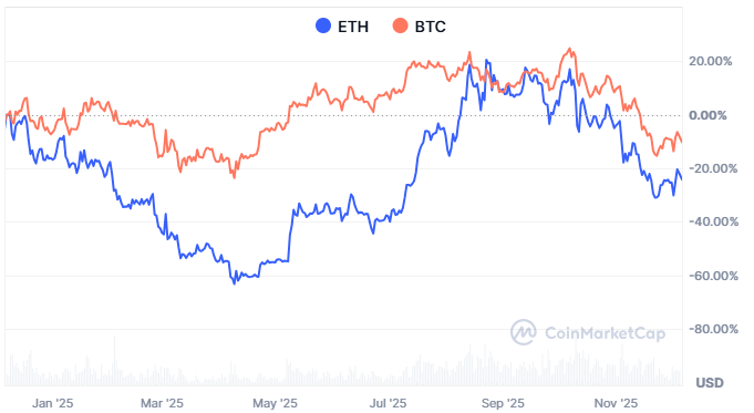 2025年ETH-BTC对比走势图显示,以太坊在早春期间表现持续落后。1月至5月ETH大幅下挫,而BTC保持相对中性。年中趋势逆转,ETH在6月下旬至9月强势回升,几乎追平比特币水位后再次回落。