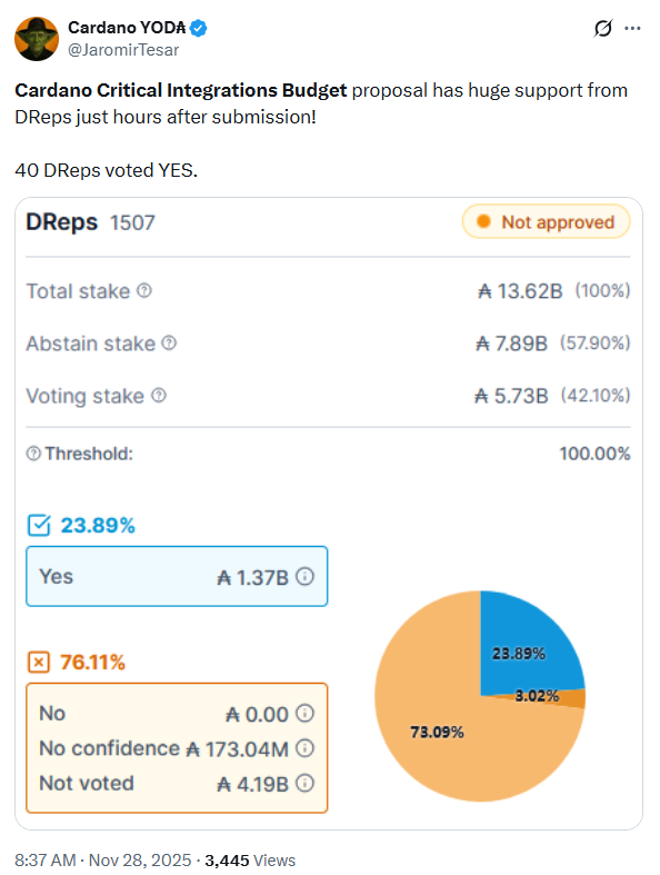 随着网络活动增长,卡尔达诺通过1100万代币策略。创始实体提交了7000万美元的核心集成计划。早期DRep投票显示社区兴趣,卡尔达诺正在审议该提案。