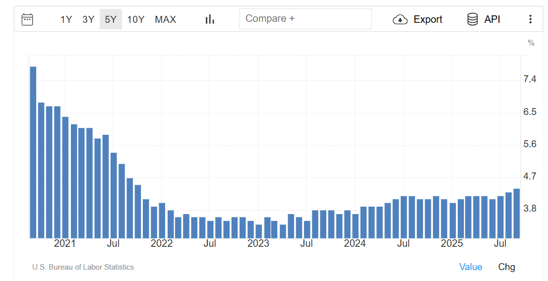 自2021年10月以来,美国失业率首次突破4.4%——这正是美联储准备加息的时期。四年后重返这一水平,意味着美联储需要采取更迅速的行动。不过9月非农就业人数119,000的数据部分缓解了这种紧迫性。