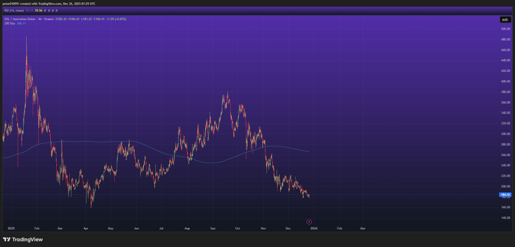 2025年中期SOL数次尝试反弹,每次反弹均在阻力区附近停滞并回落。至秋季,下跌趋势愈加明显,价格跌破长期支撑位。通常作为趋势过滤器的200日移动平均线由支撑转为阻力。